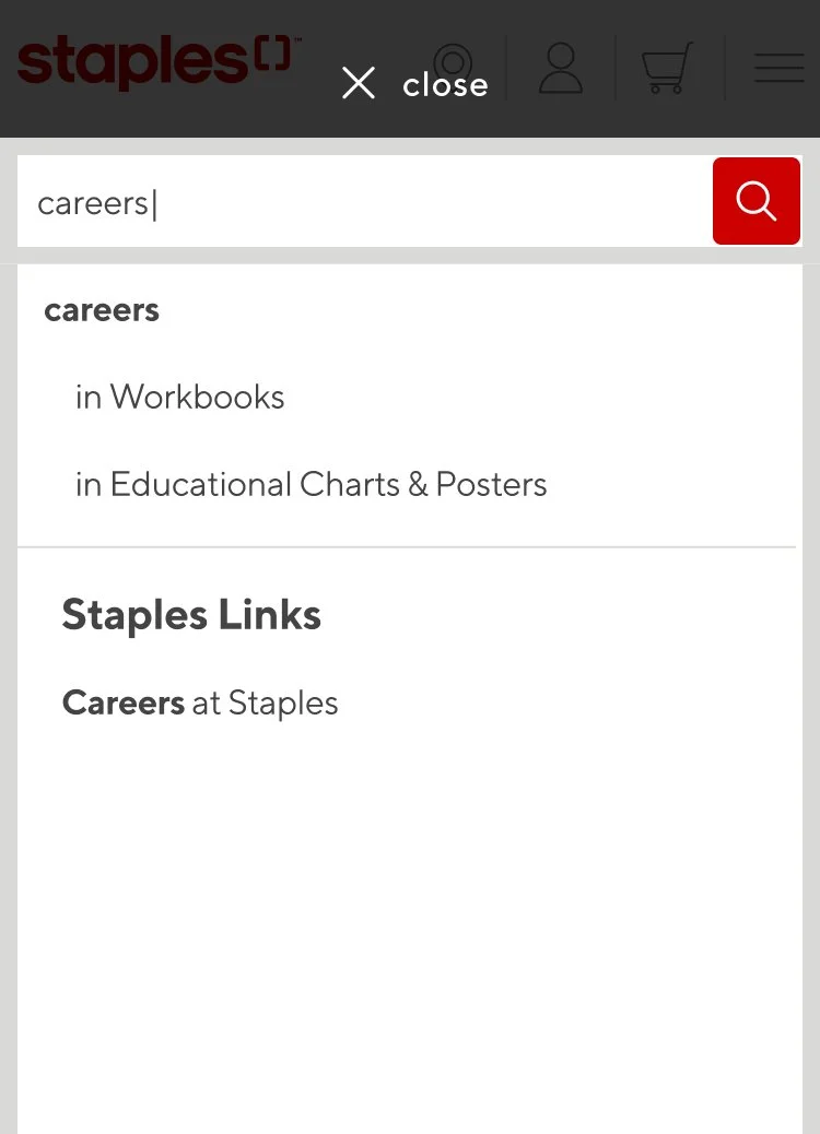 These screens occur when a user enters a search query that relates to a Staples link. For example the “Careers” link will show when the user types in “Career” or “Careers” but not “car”.